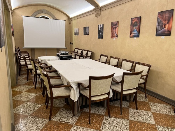 La sala de reuniones del Art Hotel Commercianti es ideal para eventos de pequeño formato como conferencias, presentaciones, reuniones de empresa y eventos profesionales. Ubicada en pleno corazón del centro histórico de Bolonia, a pocos pasos de la Piazza Maggiore, ofrece un ambiente elegante y profesional con una atmósfera íntima y acogedora para los participantes. Cabe destacar que la sala de reuniones está disponible únicamente por las tardes.